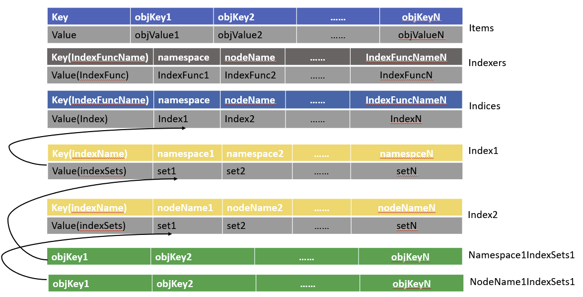 通过在向items插入对象的过程中,遍历所有的Indexers中的索引函数,根据索引函数存储索引key到value的集合关系,以下图式结构可以很好的说明: