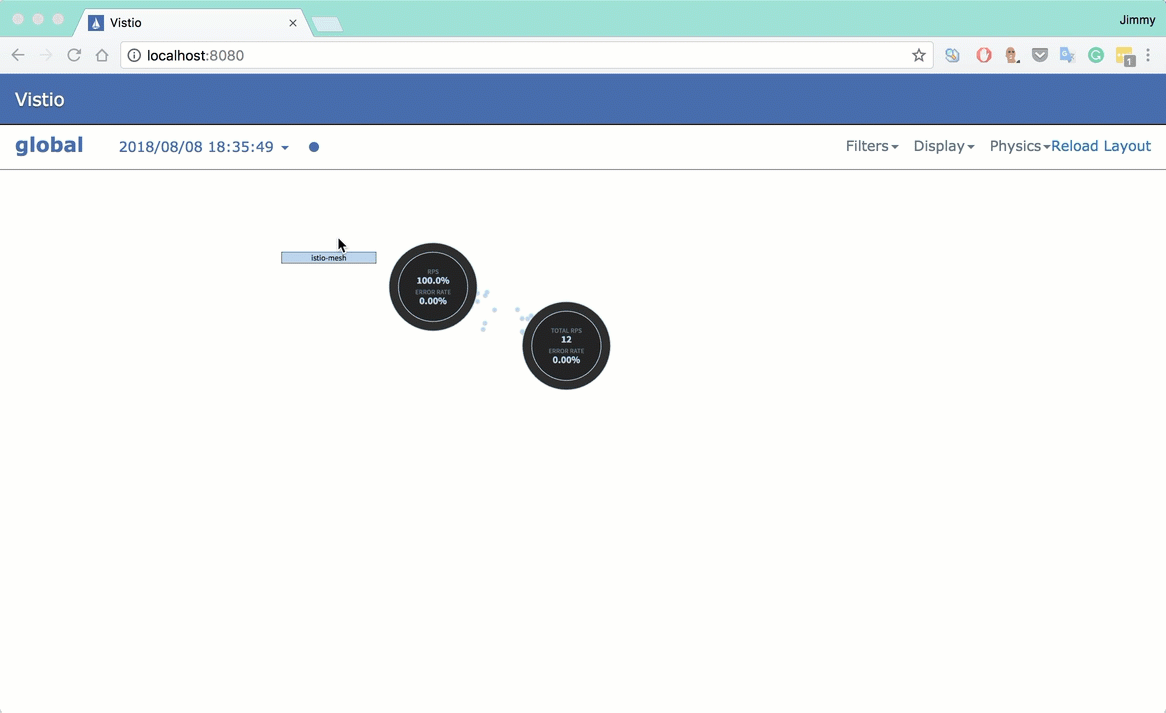 如果一切都已经启动并准备就绪,您就可以访问Vistio UI,开始探索服务网格网络,访问http://localhost:8080 您将会看到类似下图的输出。